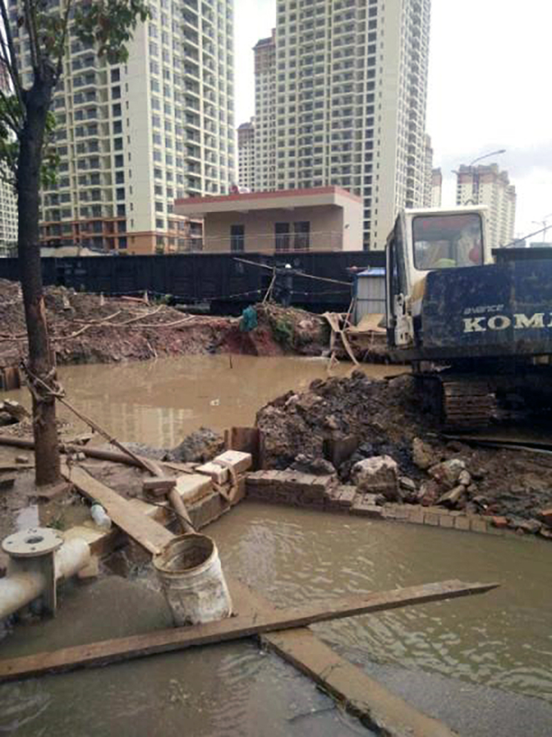 为防止突发险情,现场抢修人员采取排水支护安全措施后,采用人工与设备交差进行开挖,抢修人员相互配合、开挖作业坑、管道抽排水、钢外套焊接补漏、水泥填封,各项工作争分夺秒地进行着。眼看着水管即将修复,可天公不作美,当水泥填封进行到一半时,暴雨又再次来袭,抢修人员虽用施工雨伞进行遮挡,但仍然抵不住暴雨的侵袭,作业坑很快被雨水淹没,只能等到雨停的时候再进行水泥填封。